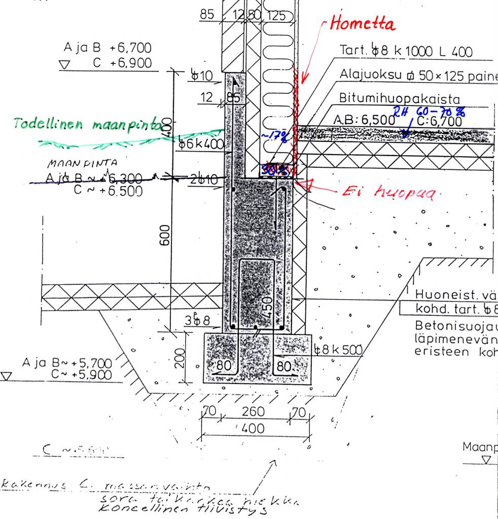 Olisin ostamassa asuntoa (puinen rivitalo 1988). Pelkäsin valesokkelia, mutta sain rakennnepiirokset ja kuvan mukaan olisi tehty tuolla suoralla sokkelilla. Onko tämä suora sokkeli myös riskirakenne vai rakennetaan vieläkin tällä menetelmällä? Maan pinnasta on vain 200mm alajuoksuun ja sokkelin päältä on 250mm lattian pintaan. Joten voiko runsas luminen talvi tehdä hallaa rakenteisiin sulaessaan.