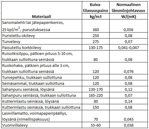 Taulukko 1. Oheisessa taulukossa on esitetty tärkeimpien luonnonmateriaaleista valmistettujen lämmöneristeiden ominaisuuksia. Taulukkoon on laskettu vertailun vuoksi lämmönläpäisykerrointa (U-arvo) 0,17 W/(m2K) vastaava eristepaksuus. Sen avulla on mahdollista muodostaa kuva eristeiden ”hyvyydestä”. Tietojen lähteet: (1) Tampereen yliopisto (materiaalit testattu 10 asteen lämpötilassa ja 65 % RH vastaavassa vesipitoisuudessa), (2) Oulun AMK, Paibira-hanke (kuivien materiaalien arvoja).
