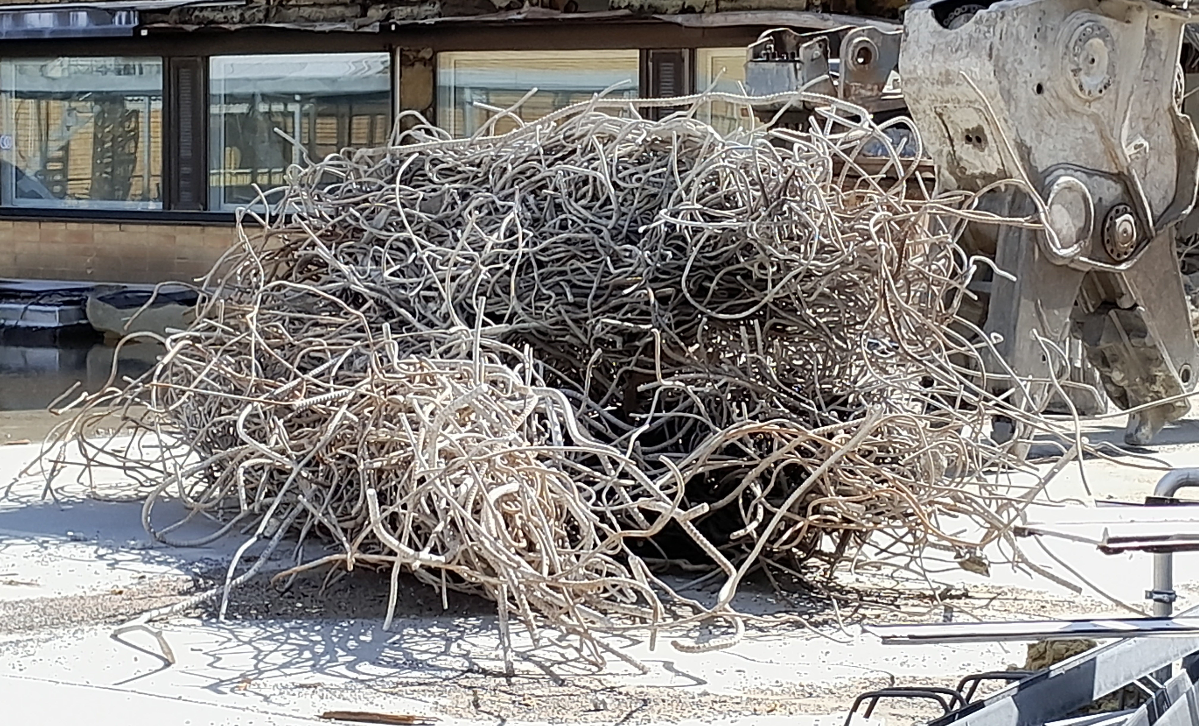 Kuva 6. Kalvomuovien kierrätysastia ja purkutyömaan terästä taiteellisessa nipussa.