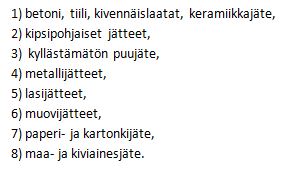 Jäteasetuksen (179/2012, 16 §) mukaan erilliskeräys tulee järjestää seuraaville rakennus- ja purkutyömaiden jätejakeille: