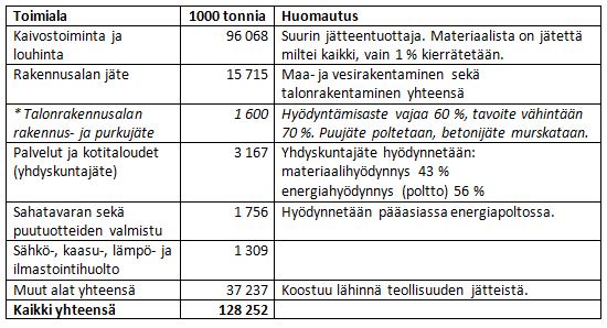 Alla olevassa taulukossa esitetään Suomessa syntyvien jätteiden määrä sektoreittain. Taulukkoon on lisätty huomioita jätteen hyödyntämismääristä ja -tavoista. (Jätetilasto 2018, Tilastokeskus).
