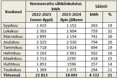 Ohessa on taulukko, josta näkyy normeeratut energiankulutuksen arvot kuukausittain. Mielenkiintoisin sarake on säästö, joka on esitetty kilowattitunteina ja myös prosentteina. Euromääräinen säästöhän voidaan laskea lukemista kertomalla säästetty kWh-määrä kyseisen kuukauden sähköenergian kokonaishinnalla (energiahinta+siirtohinta). Taulukossa on esitetty tulokset lämmityskaudelta 2023-2024. Sähkön säästö oli 4 722 kWh verrattuna kulutukseen ennen ilpin asentamista (lämmityskausi 2022-2023). Eli ilmalämpöpumppu säästi tuon verran. Seuraavalla lämmityskaudella 2024-2025 säästöä syntyi hieman enemmän eli 5 497 kWh (näitä lukemia ei ole esitetty taulukossa). Säästölukemien prosentteja tarkasteltaessa on huomattava, että kulutuslukemiin sisältyy myös erillisen talousrakennuksen kulutus, johon ilmalämpöpumpulla ei ollut säästövaikutusta. Näin olle todelliset säästöprosentit ovat esitettyjä suuremmat.