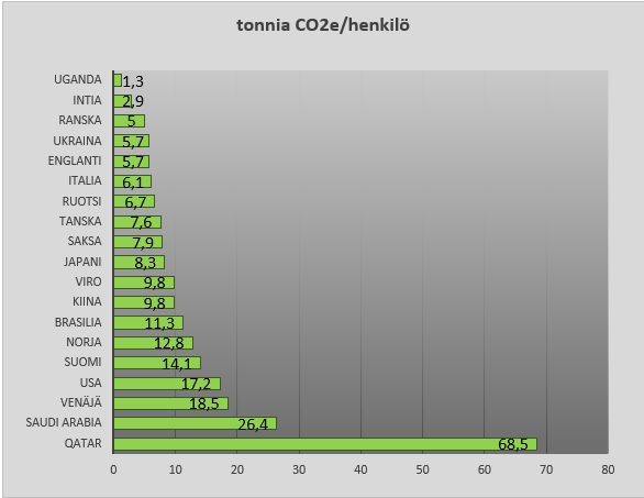 Päästöt asukasta kohti laskettuna Suomessa ja muualla maailmassa