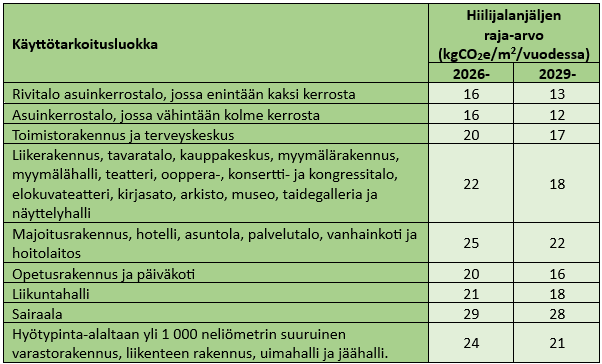 Ympäristöministeriön mukaan vuosille 2026-2028 raja-arvot on asetettu varsin maltillisille tasolla. Tavoitteena alkuvaiheessa on, että saataisiin kokemusta tästä uudesta menettelystä ja talonrakennusala omaksuisi käytännön. On arvioitu, että jo nykyisellä toteutustavalla rakennukset pääsisivät tavoitearvoon ilman mitään erityisiä toimia. Vuoden 2029 alusta lähtien raja-arvot tiukentuvat merkittävästi. Tulevat tiukennetut arvot on jo nyt esitetty asetuksessa. Raja-arvot voidaan laskea myös koko elinkaaren ajalle, jolloin taulukossa olevat vuosittaiset arvot kerrotaan 50 vuodella. Etenkin Keski-Euroopassa käytetään tätä esitystapaa. Siten esimerkiksi rivitalolle koko elinkaarelle laskettu raja-arvo on 50×16=800 kgCO2e/m2.