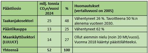 - Maankäyttösektorin päästöt 2024. Syke. https://www.luke.fi/fi/uutiset/maankayttosektori-pysyy-suurena-paastolahteena-mutta-metsat-ovat-pieni-nielu-kasvihuonekaasuinventaarion-2024-ennakkotiedoissa