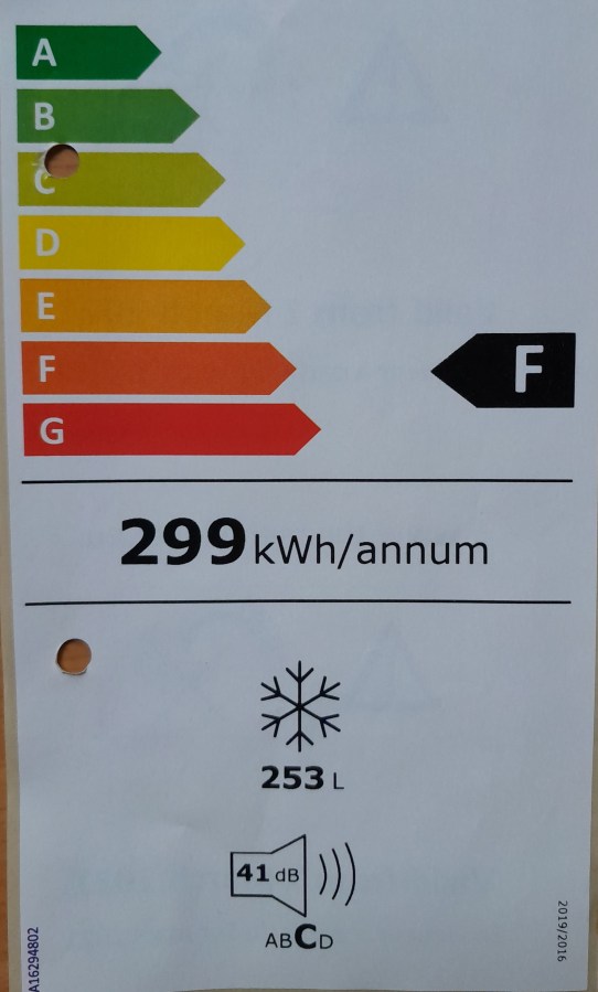 Erään melko uuden pakastimen energiamerkintä, jonka mukaan vuotuinen kulutus on 299 kWh/v.
