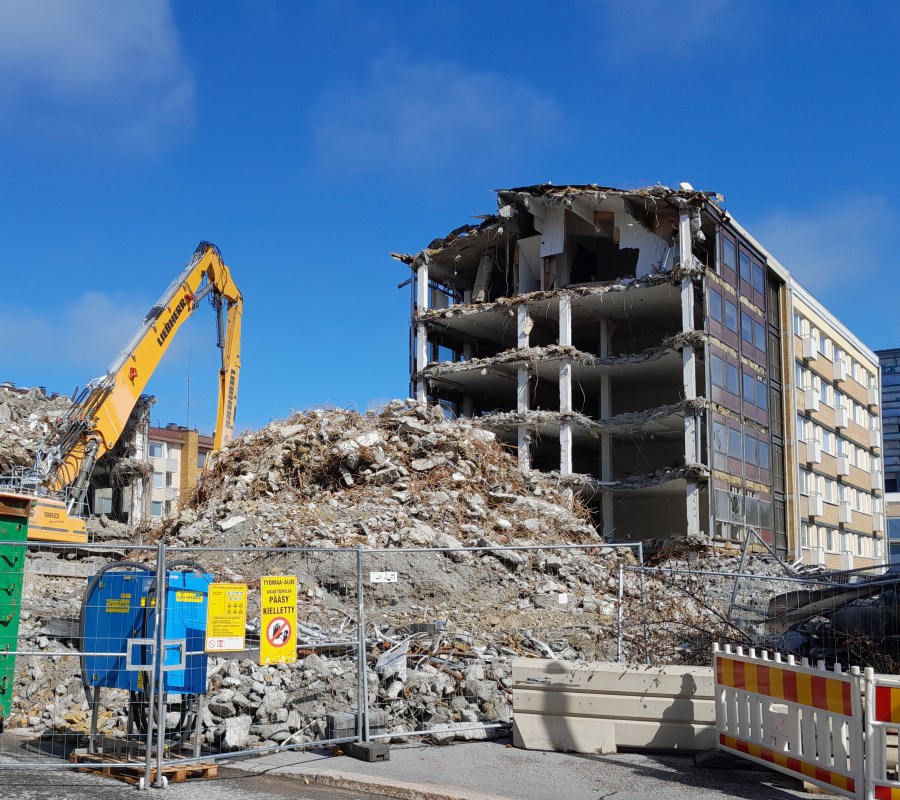 Kuva 4. Purkutyömaalla on usein kovin ahdasta, niin itse purkamisen kuin myös purkumateriaalin lajittelun kannalta. Kun kerrostaloa puretaan, niin kovin sekalainen kasahan siitä syntyy.