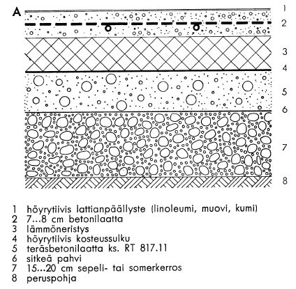 Lämmitetty maanvaraisalapohja. Tiivistä lattiapinnoitetta käytettäessä tuli lattiaan ehdottomasti asentaa höyrysulku. RT 839.15. Vuodelta 1957.