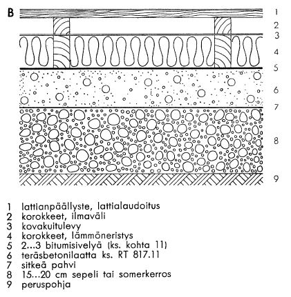 Koolattu puulattia lämminilmalämmitystä käytettäessä. Höyrynsulun käyttöä suositeltiin voimakkaasti, tässä tapauksessa bitumisively. RT 839.15. Vuodelta 1957.