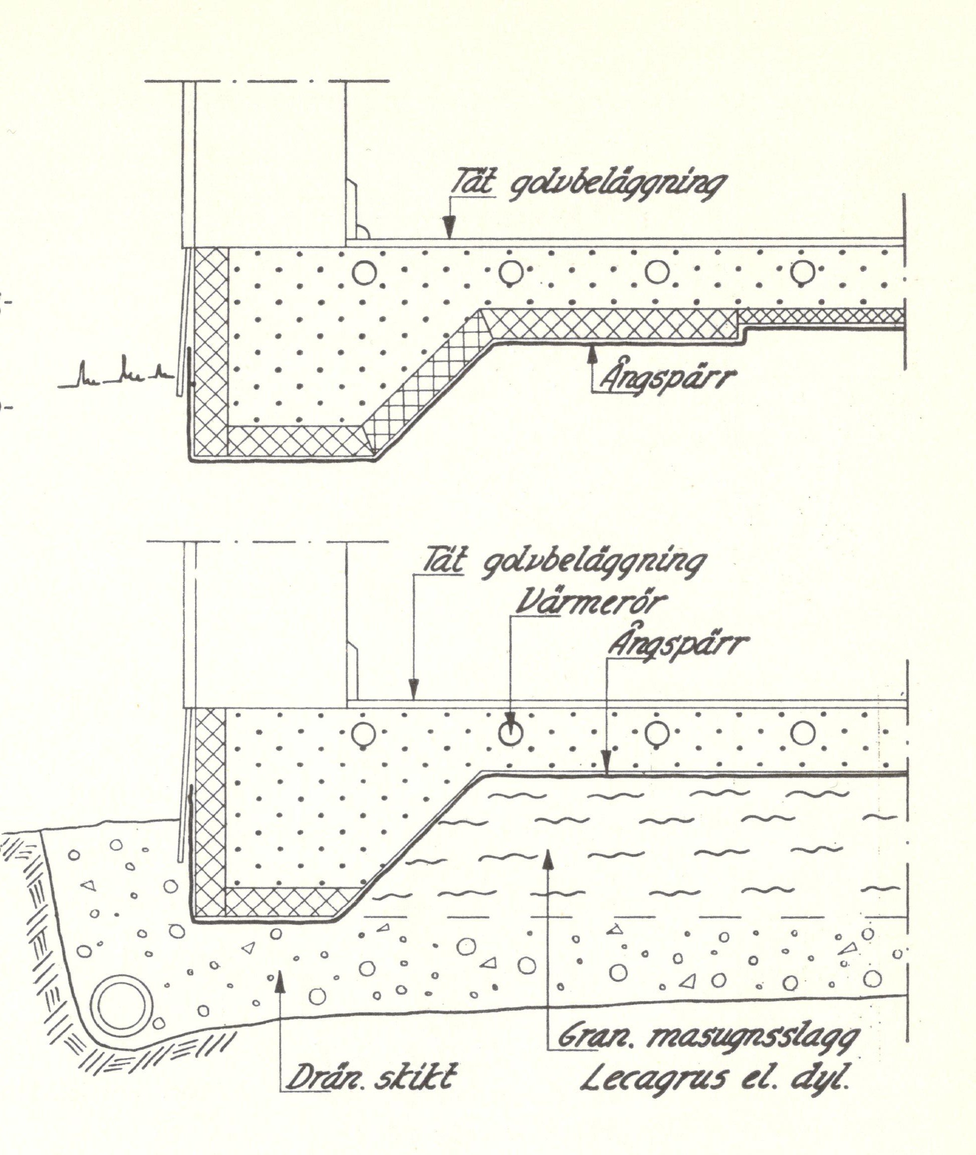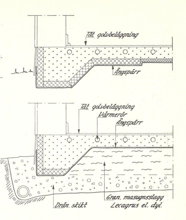 Toinen ratkaisu on muuten samanlainen, mutta siinä laatan alla eristeenä on kevytsora. Höyrynsulku on heti betonilaatan alla. Kapillaarikatko on välttämätön laatan alla. Ericsson 1960 (1956)