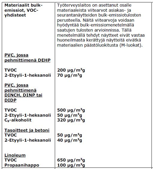 Työterveyslaitos. Bulk-emissiotulosten viitearvoja.